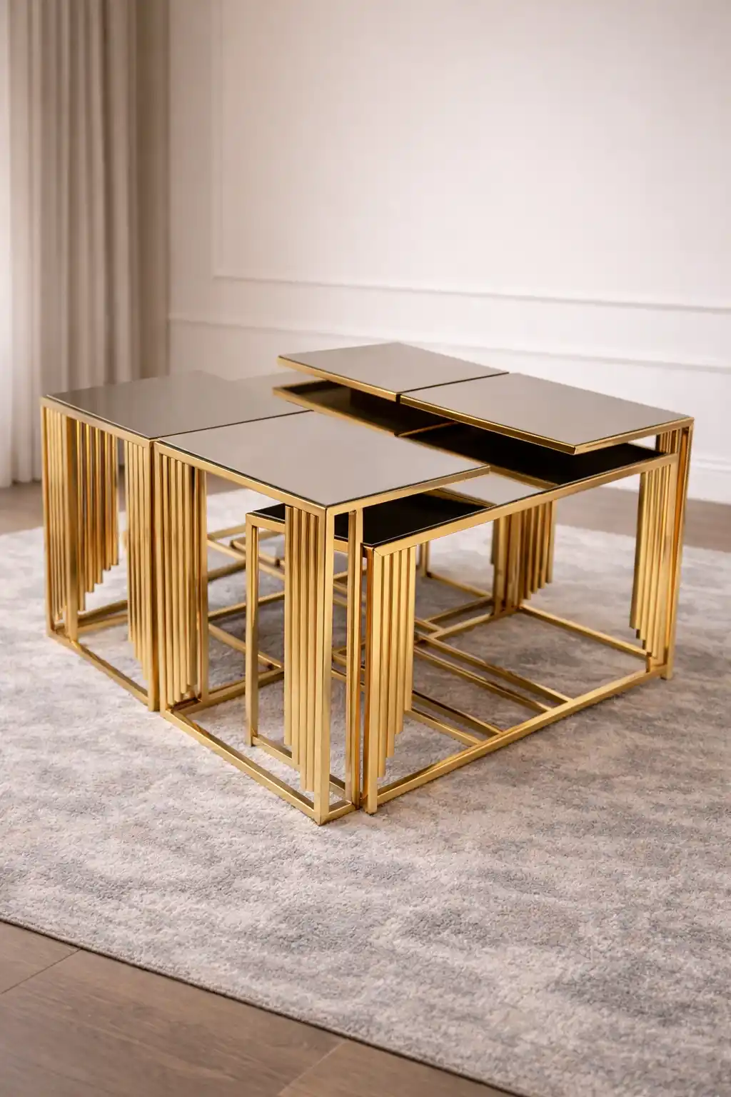 Kares 4+1 Kare Sehpa Seti – 4’lü Zigon + Kare Orta Sehpa | Metal İskelet Cam Tabla