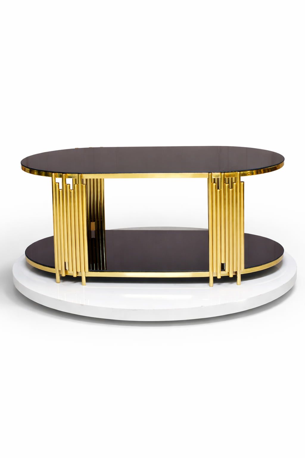 Fairfax Oval Orta Sehpa - 60x110 cm Çift Katlı Siyah Camlı Gold Metal Salon Sehpası