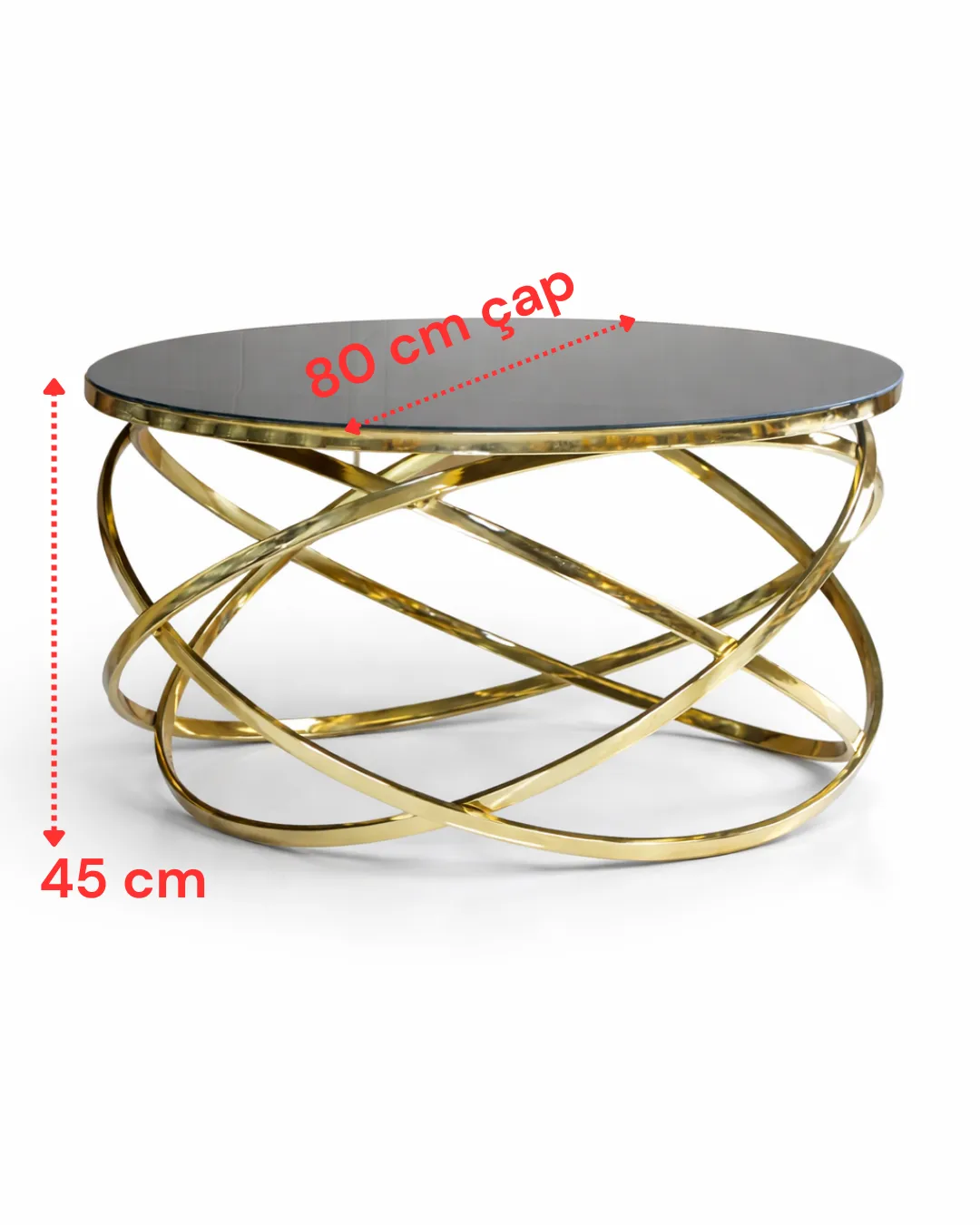 Elips Model Lüks Orta Sehpa, modern dekorasyon anlayışını estetik detaylarla buluşturan özel bir tasarıma sahiptir. Gold metal ayak yapısı ve siyah cam üst tablası ile güçlü bir kontrast oluşturan bu model, yaşam alanlarında dikkat çekici ve sofistike bir görünüm sunar. İç içe geçen elips formundaki metal ayaklar ürüne özgün bir karakter kazandırırken, parlak siyah cam tabla tasarımı şık ve tamamlayıcı bir etki sağlar.