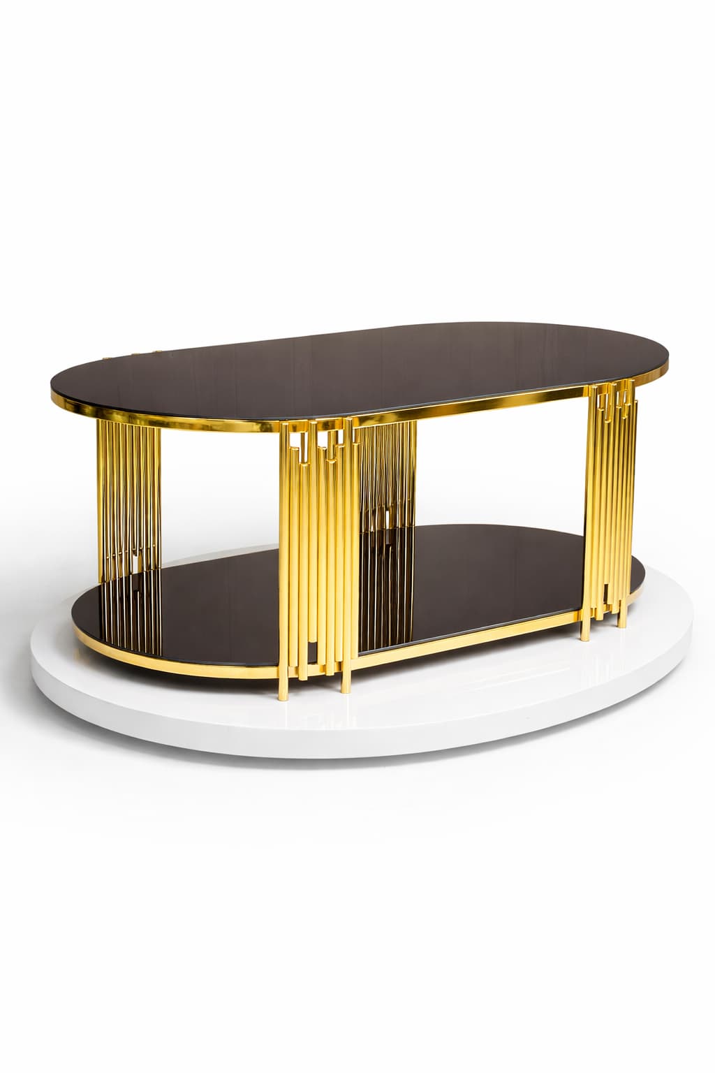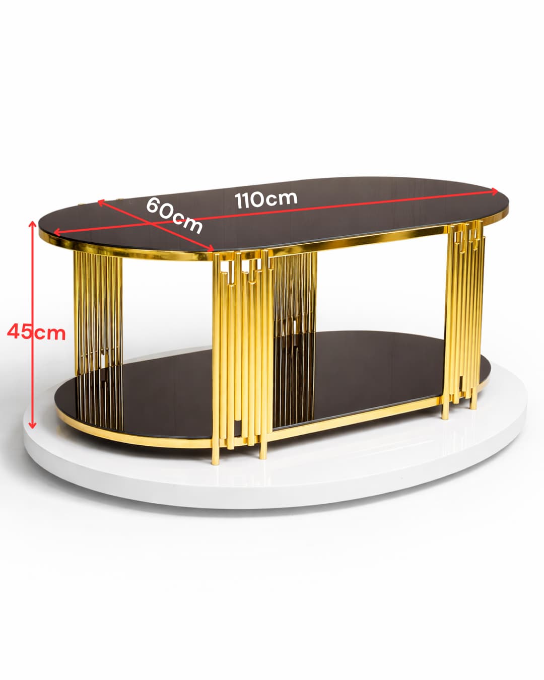 Fairfax Oval Orta Sehpa – 60×110 cm Çift Katlı Siyah Camlı Gold Metal Salon Sehpası