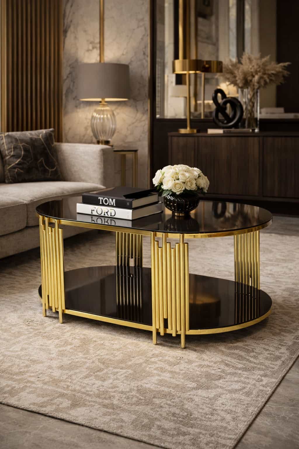 - Fairfax Oval Orta Sehpa – 60×110 cm Çift Katlı Siyah Camlı Gold Metal Salon Sehpası